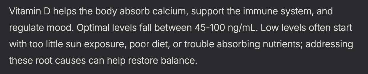 It's so impactful, that I recommend that everyone check their Vitamin D blood levels via a lab test every 12 months at a minimum, and that they supplement to keep themselves in an optimal range for OPTIMAL health.