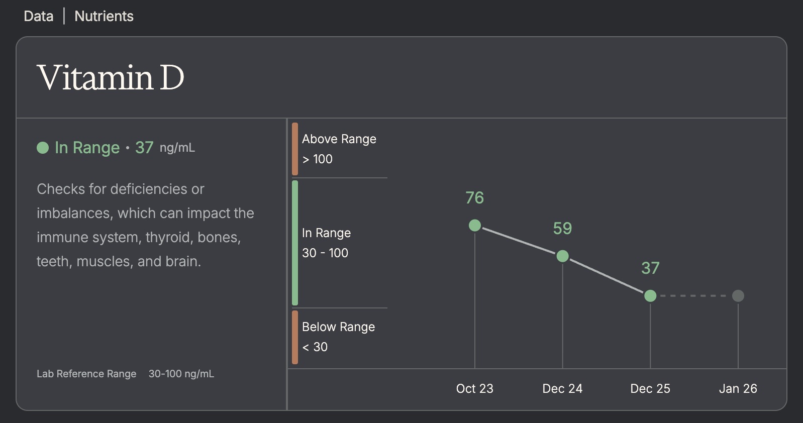 As of my last test in June, my levels were fine at 59, but as the weather has turned cold and I haven't been getting outdoors as much, my levels have now fallen to 37 as of this week's newest testing, so I will be upping my supplementation to get those levels back up between now and my next test in 6 months.