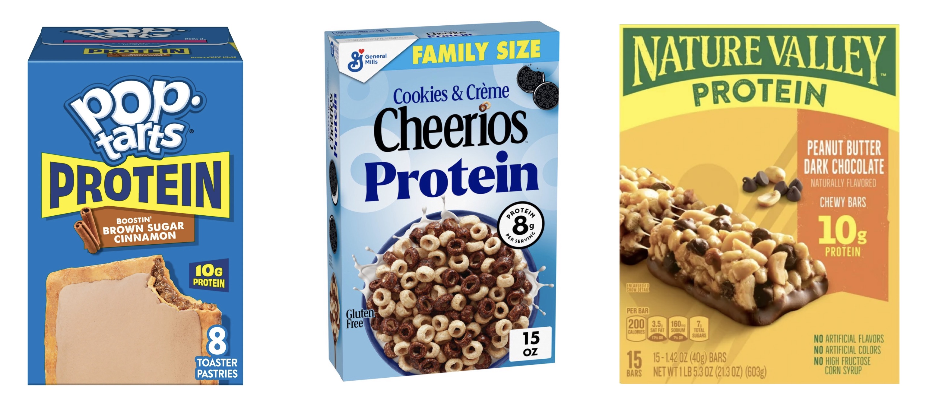 "Protein" Cheerios - Again, these say high protein, but at only 8 grams of protein per 150 calories. these come in at only 21% protein overall, which means 79% carbohydrate and fat. Not a good source of protein at all. Better than the Poptarts, but not GOOD.